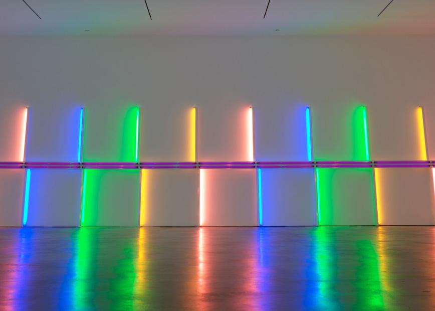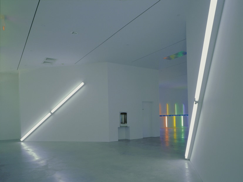Visitors are welcomed by two of Flavin’s sculptures before entering a 6,400-square-foot main room filled with alternating pink, yellow, green, and blue fluorescent tubes. A smaller gallery houses Flavin’s “monuments” for V. Tatlin, 1964–69, and on the exterior is a band with two ranks of eight-foot green fluorescent tubes.